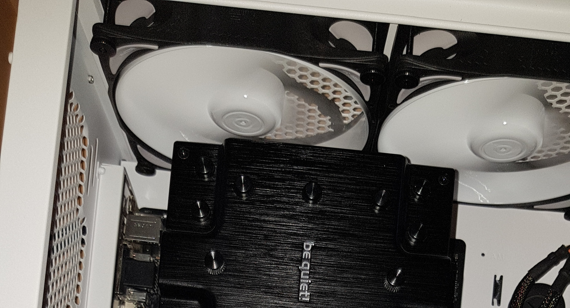 Aufgrund dessen, dass die Lüfter mehr Luft befördern, habe ich von den insg. 2 CPU-Kühler-Lüftern 1 entfernt. Das wäre hier der kleine 120mm. Nun zieht und bläst der 140mm Lüfter in der Mitte des Kühler die Luft in Richtung Deckel, in dem 2 der 5 neuen Lüfter arbeiten. War vorher auch so, aber die waren ja nicht so stark. Dadurch wird es noch ein bisschen leiser.