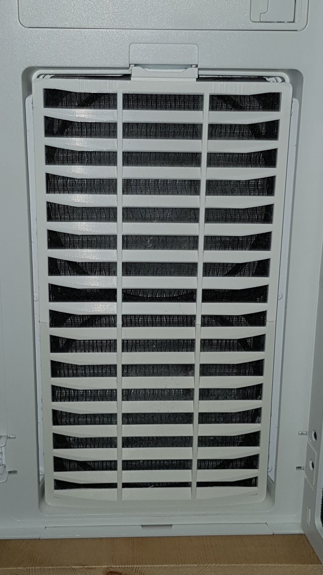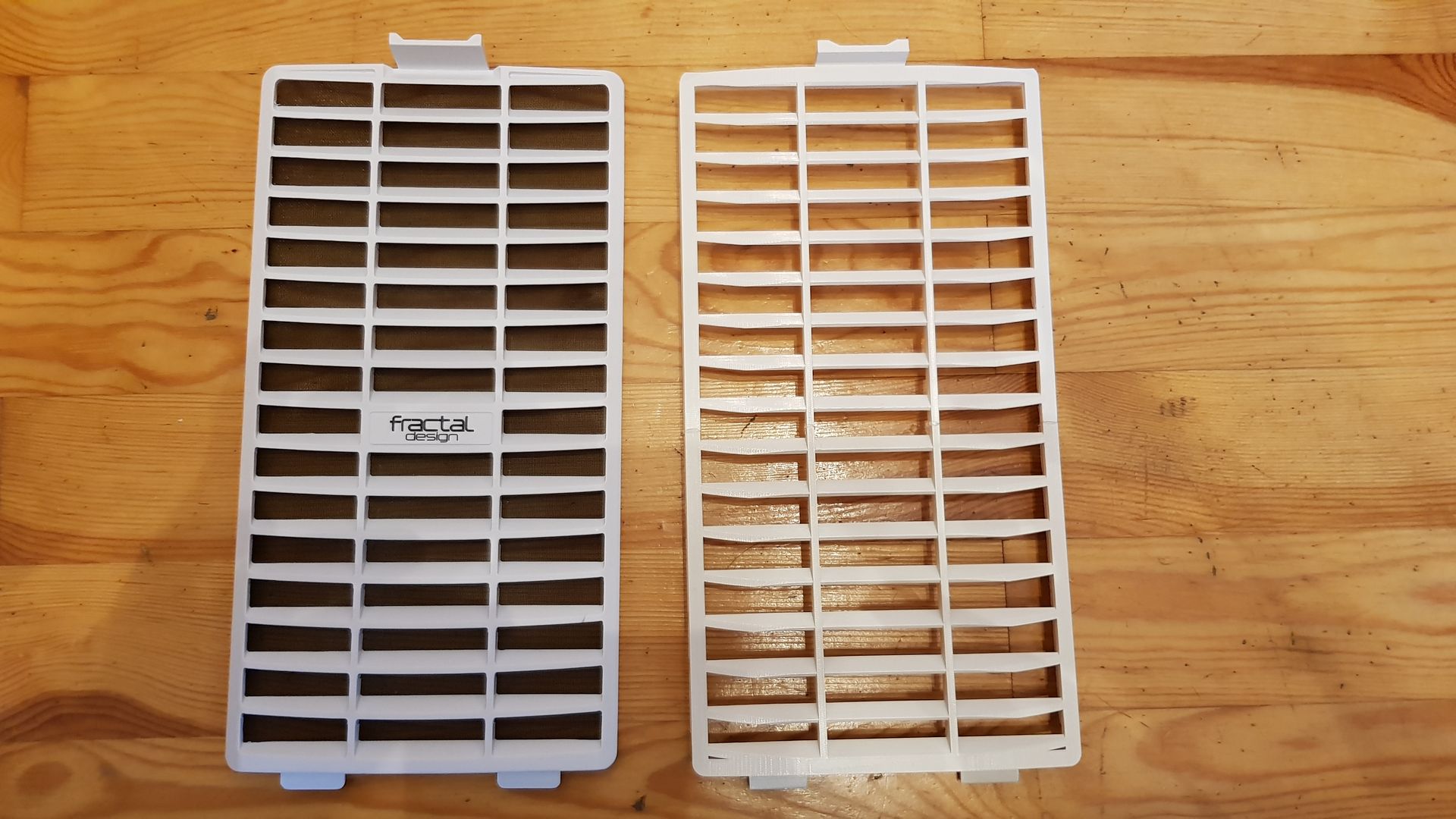 Auf dem ersten Bild sieht man das Original und meinen Nachbau – noch ohne Staubfilter. Auf dem zweiten ist er schon mit und eingebaut. Die Maße sind jetzt nicht 100% genau, aber es hält wunderbar. Das Gitter liegt hier auf den Lüftern auf. Als Staubfilter habe ich das DustEND G1, extra widerstandsarm genommen und mit Sekundenkleber auf der Gitter geklebt.