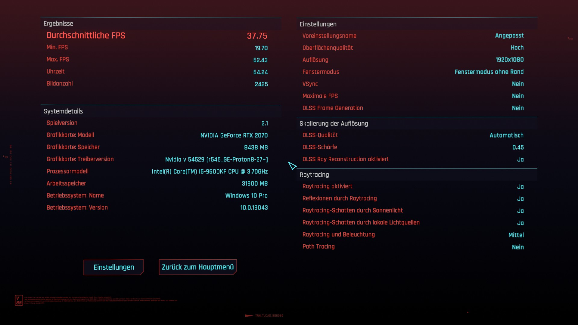 - Plattform: Steam (Steam Play, GE-Proton8-27, Parameter: PROTON_ENABLE_NVAPI=1 VKD3D_CONFIG=dxr11,dxr gamemoderun %command% –launcher-skip –intro-skip –skipStartScreen)