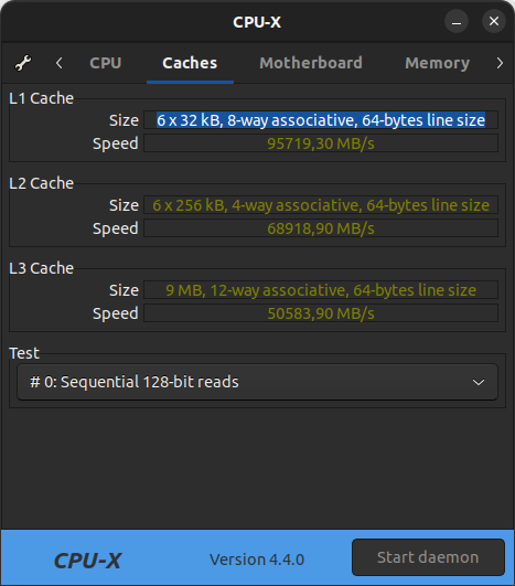 Caches: | L1: 6x 32 KB, 8-way associative, 64-byte line size L2: 6x 256 KB, 4-way associative, 64-byte line size L3: 9 MB, 12-way associative, 64-byte line size |