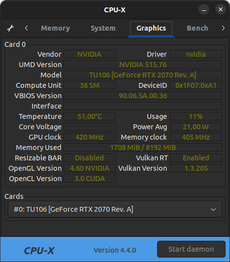 Grafikchip: | TU106 Architektur: Turing Technologie: 12nm Shading Units: 2304 TMUs: 144 ROPs: 64 RT Cores: 36 Features: DX12 Ultimate (12_2), Vulkan 1.2, OpenGL 4.6, CUDA 7.5, Shader Model 6.5, OpenCL 1.2 |