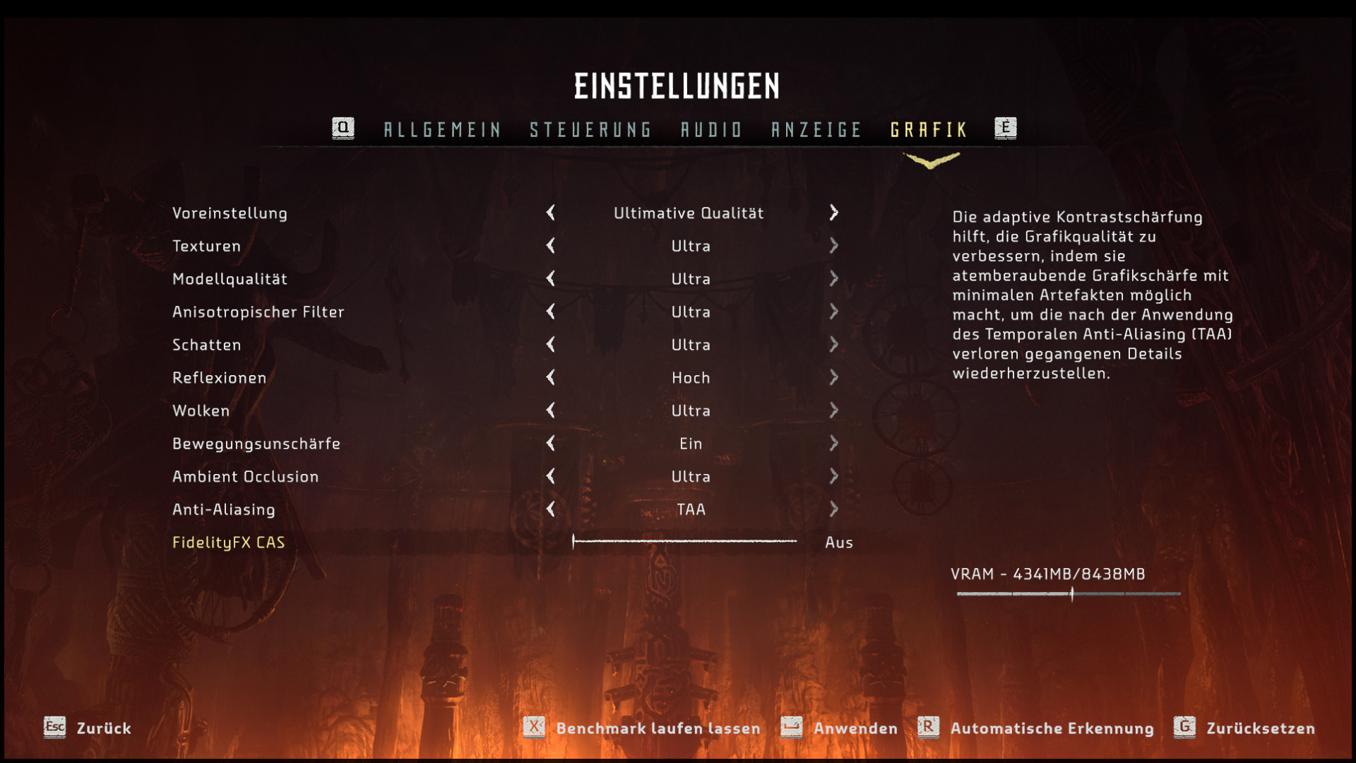 - Detailstufe: Ultra (FidelityFX CAS aus)