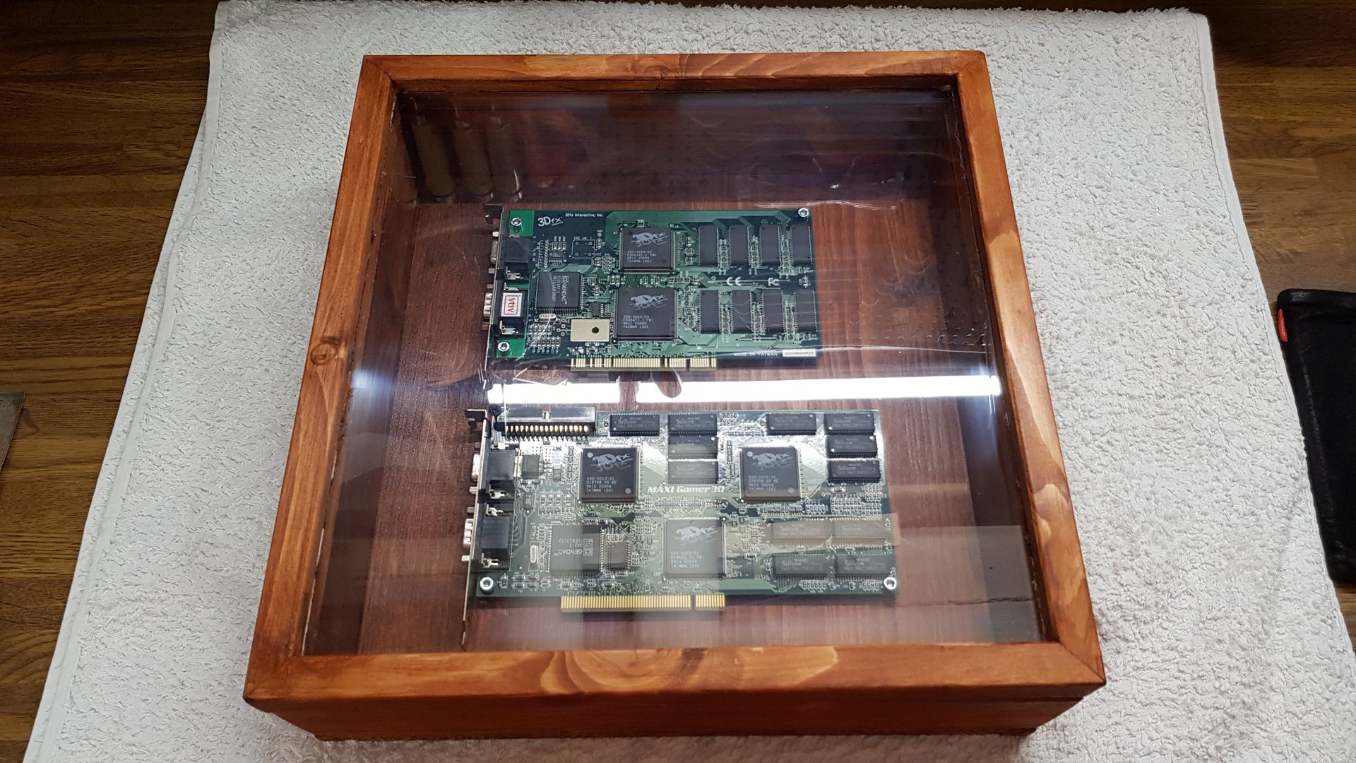 Heute (14. Oktober 2020) habe ich endlich meinen Schaukasten für meine zwei 3Dfx 3D-Grafikbeschleuniger-Karten fertiggestellt. Diesmal bin ich auf jeden Fall einigermaßen zufrieden. Die Maße sind diesmal auch einigermaßen gut geworden, obwohl ich trotzdem Probleme hatte.