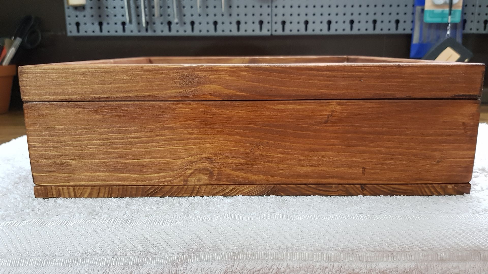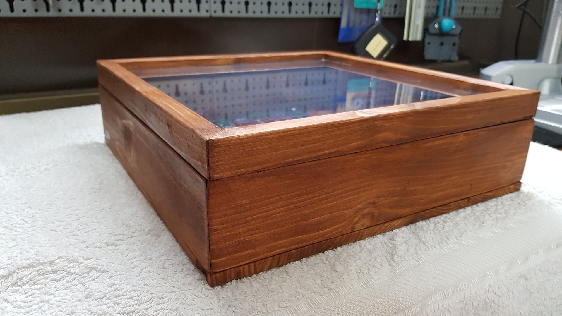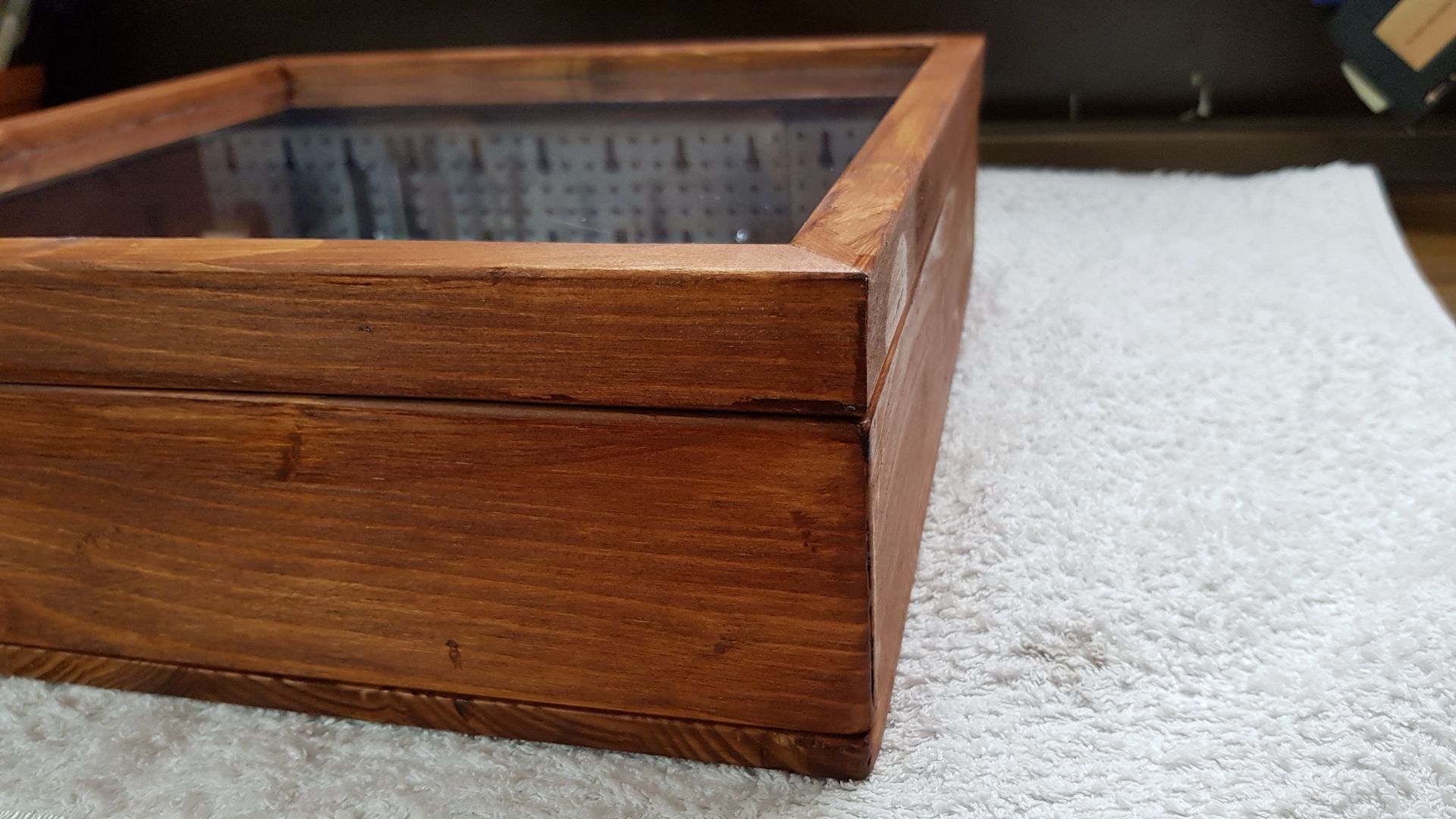 Die Gehrung der Rahmenhölzer sind irgendwie falsch geworden. Zwar hat meine Gehrungssäge 45° horizontal geschnitten, jedoch vom Holz irgendwie zu viel weggenommen, weswegen u.a. zwei Hölzer 33,8 cm, eins 33,7 cm und eins 34 cm lang wurde. Dadurch musste ich die Montageplatte nachfräsen und die Deckelhölzer auch etwas kappen. Die Spaltmaße sind auf jeden Fall besser als beim ersten Kasten. Bei der Montageplatte habe ich mich allerdings mal verfräst, weil ich abgerutscht bin. Mist! Die Lasur ist leider wieder nicht ganz so perfekt geworden. Vielleicht liegt es aber auch an dem OBI-Zeug. Ich habe die Deckelhölzer jedoch vor der Lasur verleimt, weswegen die Plexiglaseinfassungen nicht lasiert sind. Den Deckel habe ich nun mit Holzdübeln befestigt. Die Dübel sind allerdings nur am Rahmen geleimt, sodass man den Deckel notfalls abnehmen kann.