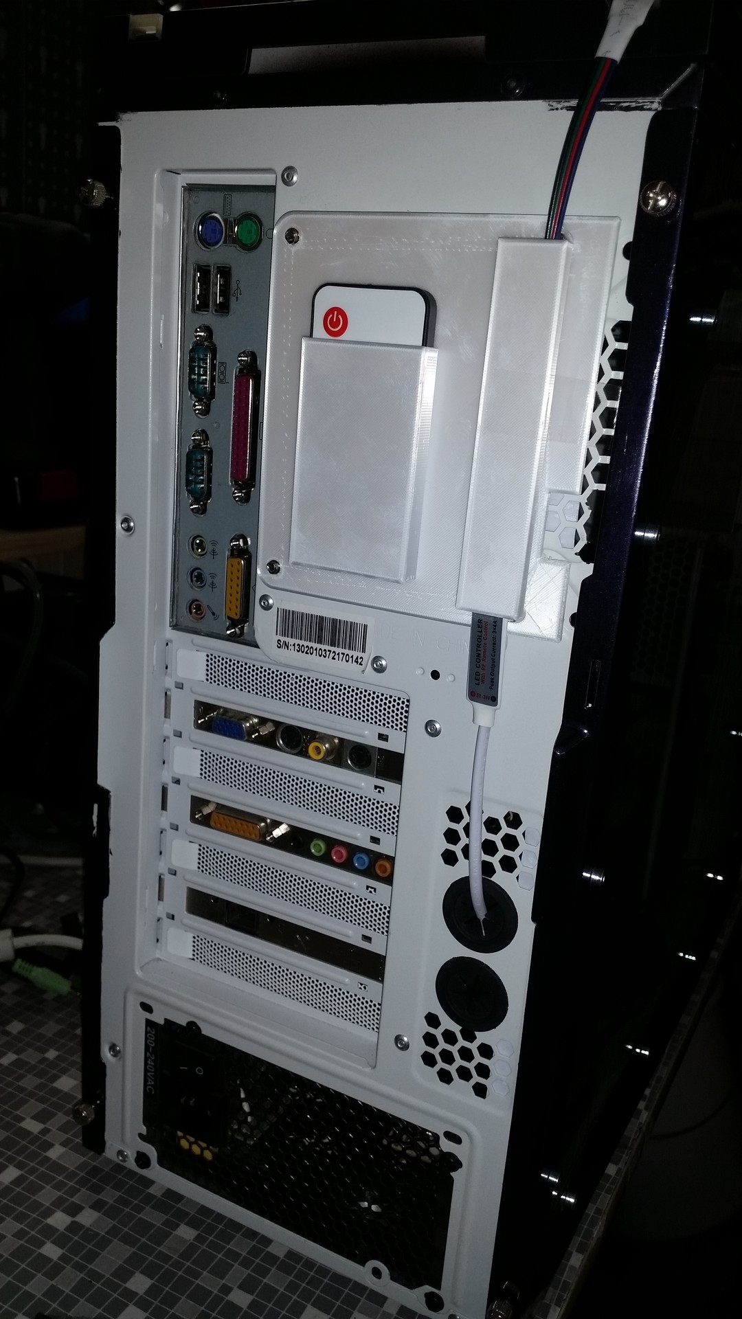Da wo nun die Lichtleisten sind, waren früher Lufteinlässe bzw. so Lüftungsgitter, wie man es noch oben auf der Kopfabdeckung sieht – jedoch in schwarz. Die Lichtleisten habe ich selber aus naturellem PLA gedruck. Wenn die LEDs aus sind, dann ist die Farbe des Plastiks leicht gelblich, was einen warmen Retro-Look hinterlässt. Eigentlich wollte ich nur jeweils eine LED an den Enden der Lichtleisten verwenden. Da sich Lichtleiter aber schwierig mit einem FDM 3D-Drucker drucken lassen, habe ich mich für einfache RGB LED-Streifen entschieden. Diese haben zwar kein Lauflicht, können jedoch die Farbe wechseln. Ein Video gibt es zum Schluss. 🙂 Da ich leider auch nicht die Lichtleisten komplett drucken konnte – die ich übrigens mit FreeCAD entworfen habe -, musste ich sie in der Mitte teilen und getrennt drucken. Leider hat die Diffusion des Lichts auch nicht wirklich geklappt. Sieht aber trotzdem ganz gut aus. Den LED-Streifen hab ich dann entsprechend zugeschnitten und einmal rundrum laufen lassen. Er geht hinten rechts rein, über die Kopfabdeckung, zur Front und da bis ganz nach unten. Dort habe ich dann ein Verlängerungkabel angelötet und durch die untere Lüftungsöffnungen, hinter die Front und wieder raus auf die rechte Seite geführt. Hier läuft der LED-Streifen dann nach oben, wieder über die Kopfabdeckung und endet dort dann. Die LED-Streifen sind mittels Dupond-Steckern und Steckleisten verbunden, falls man sie mal austauschen oder trennen muss. Wie auf Bild 3 zu sehen, habe ich eine spezielle Blende inkl. Halterung für den LED-Controller und die Fernbedienung entworfen. Das Stromkabel, habe ich durch die Wasserkühlungsöffnung, nach innen geführt und mit einem anderen Hohlstecker verbunden. Hier hab ich für den Stromanschluss ein altes, aber noch sehr gutes, Lautsprecherkabel genommen und zusammen mit dem Stromanschluss für die innere LED-Beleuchtung an einen Molex-Stecker gelötet.