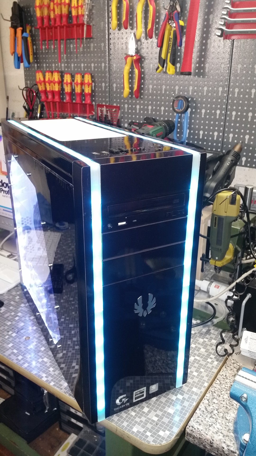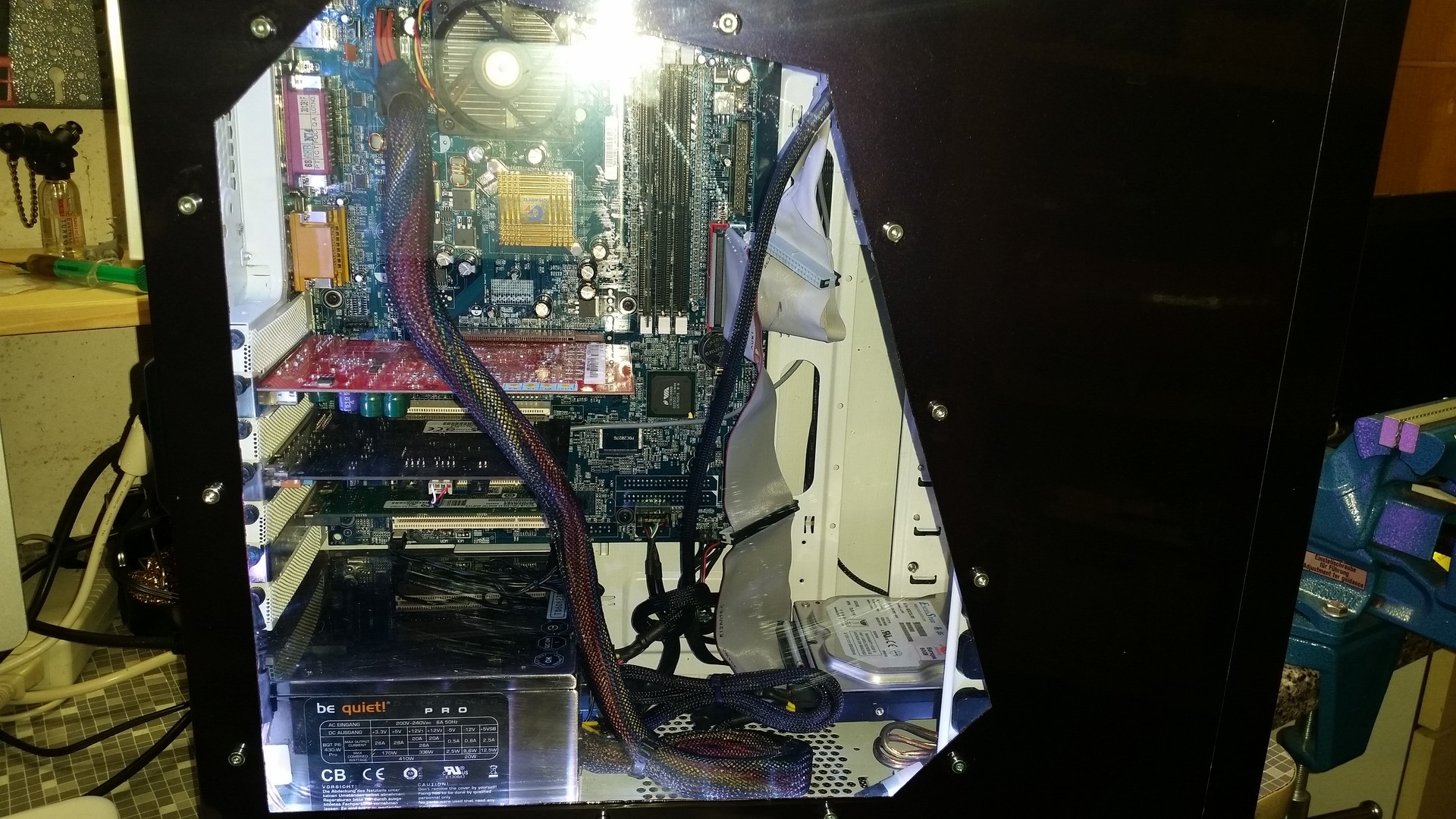 Bei dem Gehäuse handelt es sich um ein »Bitfenix Shinobi White« ohne Seitenfenster. Das schwarze Shinobi-Gehäuse mit Seitenfenster, hatte ich leider entsorgt, weshalb ich mir in das weiße extra ein Seitenfenster, im Stile des schwarzen, einbauen musste. Hier habe ich jedoch wie immer Bastelglas vom OBI genommen. Ausgeschnitten habe ich die Öffnung mit einer Stichsäge, was erstaunlich einfach von der Hand ging. Leider aber auch zum Leitwesen der Akkuratesse. Das Bastelglas wiederum, habe ich mit der Handkreissäge zurecht gesägt. Leider etwas zu groß, weswegen es nun zu Problemen beim Schließen des Seitenteils kommt. Aber es ist einigermaßen zu und unten nur ein kleiner Schlitz offen. Festgeschraubt habe ich das Fenster mit M4x10 Schrauben sowie Hutmuttern. An manchen Ecken musste ich jedoch noch 2 Unterlegscheiben einsetzen.