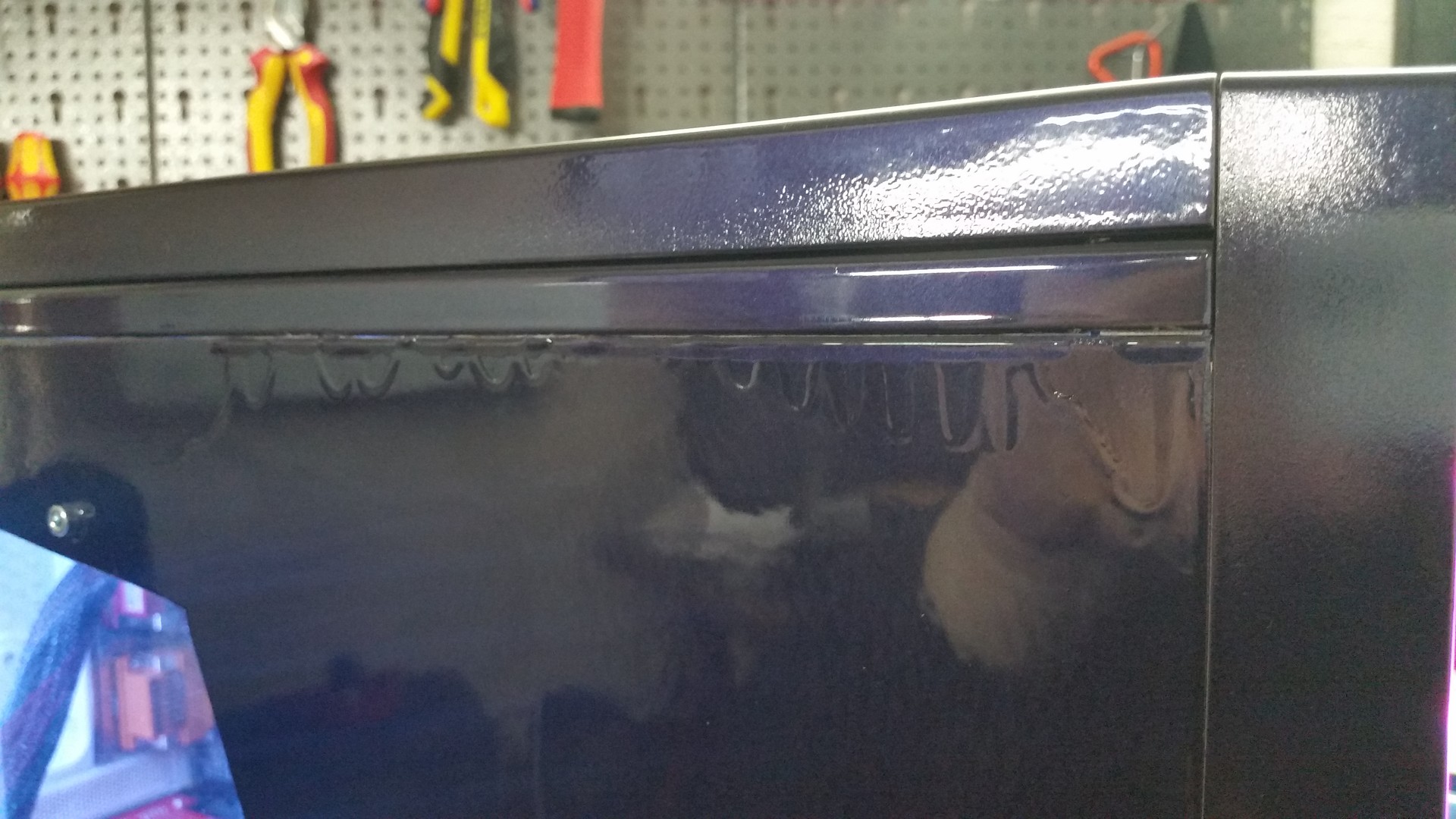 Den Gehäuse Oberteil, sowie die Seitenwände, die Front und die Kopfabdeckung samt Power- und Reset-Knopf, habe ich erst mit einem entsprechenden Grund grundiert und dann mit einem »Einhell TC-AC 190/6/8 OF Kompressor« und entsprechender Einhell Farbpistole lackiert. Die Seitenwände und den Gehäuseoberteil habe ich erst mit einer Saugbecher-Farbpistole lackiert und den Rest dann mit einer Fließbecher-Farbpistole – was viel besser lief. Der Lack wurde mit dem Saugbecher schon gut und gleichmäßig aufgetragen, allerdings gab es dann Patzer beim Klarlack – was man auf Bild 5 gut sehen kann. Es gab leider einige Läufer. Vielleicht habe ich auch einfach zu viel Klarlack aufgetragen. Es war immerhin mein erstes Mal. (˵ ͡° ͜ʖ ͡°˵) Die anderen Teile gingen besser von der Hand. Allerdings gab es zum Schluss ein paar Luftblasen und auch die linke Seite der Kopfabdeckung ist nicht ganz so gut geworden – auf Bild 5 und 6 zu sehen. Sollte ich nochmal sowas machen, kaufe oder leihe ich mir einen stärkeren Kompressor samt extra Druckregler und Filter. Bei der Farbe handelt es sich um »BMW 299 Technoviolett Metallic«.