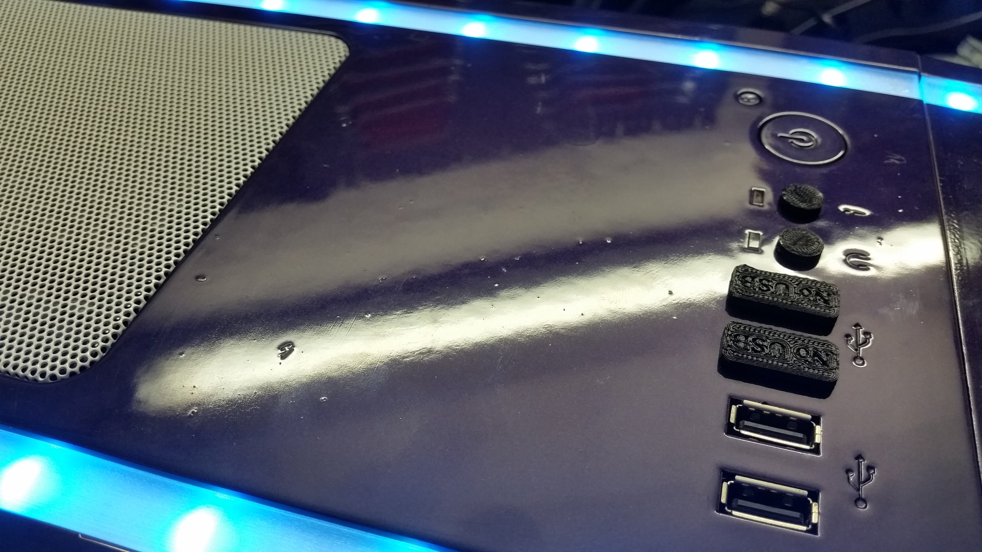 Was die Front-I/O betrifft, konnte ich nur die zwei USB 1.1 Anschlüsse anschließen. Hier musste ich sogar die Kontakte des Steckers neu anordnen, da der USB-Anschluss auf den Mainboards damals noch ganz anders war. Somit fallen die anderen beiden USB 3.0 Anschlüsse weg. Da an der Soundkarte auch kein Anschluss für Front-Audio ist, habe ich auch diese mit selbstgedruckten Kappen versehen.